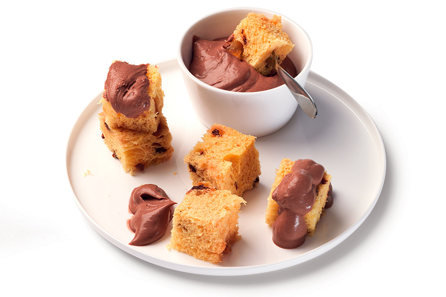 Lasciatela raffreddare, poi unitevi il resto della panna, fredda, e montate con le fruste elettriche rendendola gonfia e spumosa. Tagliate il panettone a cubi grossi e serviteli con la ganache al cioccolato gianduia.