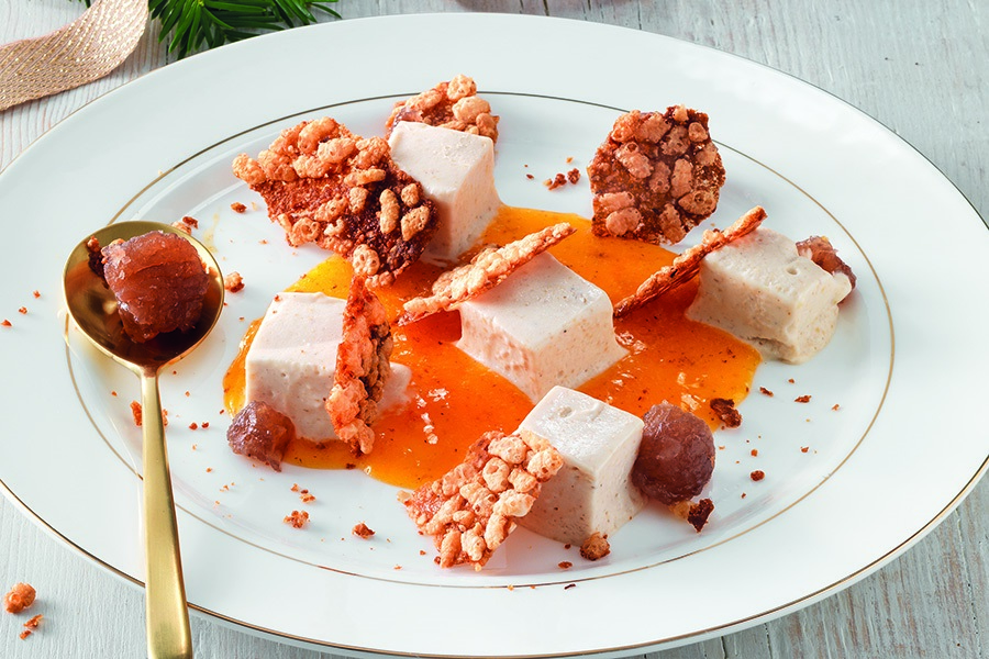- 10Sfornate, fate raffreddare la cialda e poi spezzatela. Frullate i cachi in crema aggiungendo, a piacere, 20 g di zucchero. Distribuite la crema di cachi nei piatti, unite dei dadi di semifreddo e completate con pezzetti di marron glacé e di cialda.